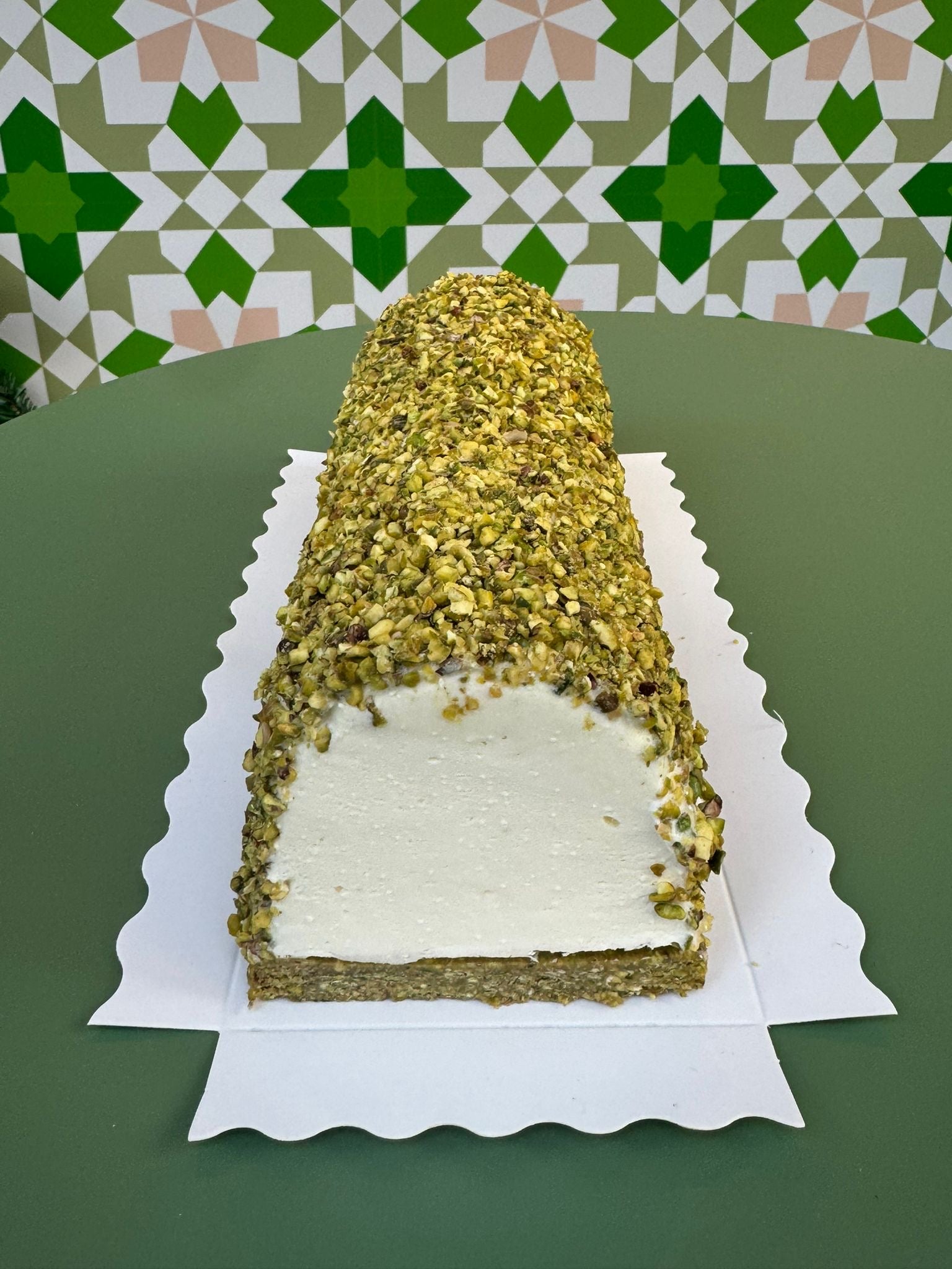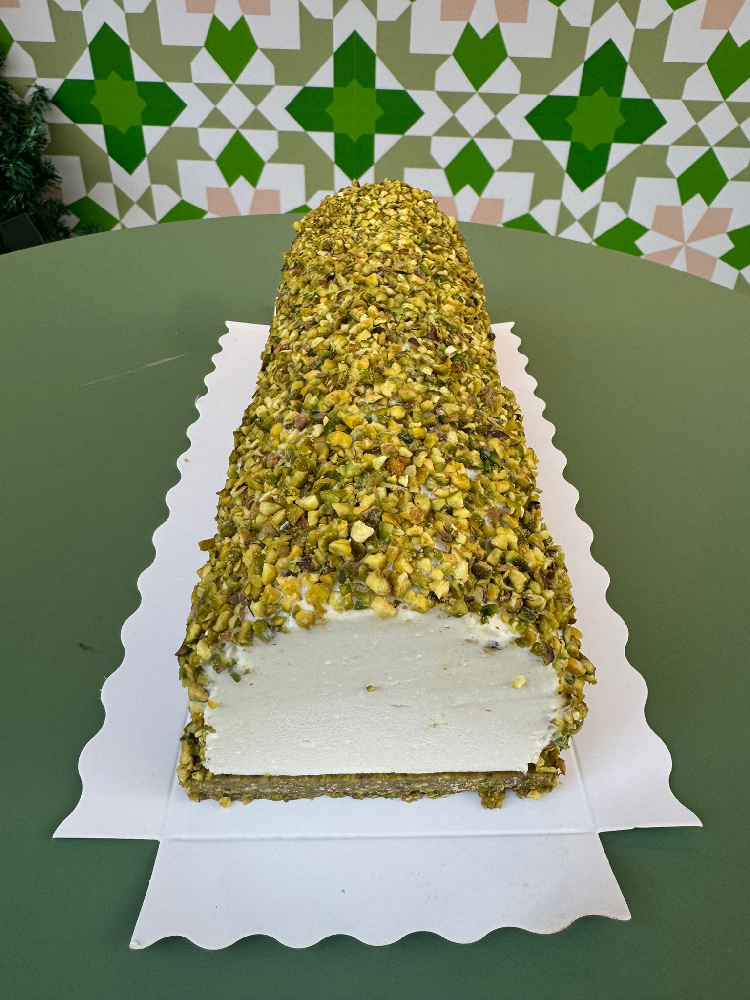 Ice cream log with your flavour of choice on a pistachio semolina base (pistachio mafroukeh) and garnished with crushed pistachios